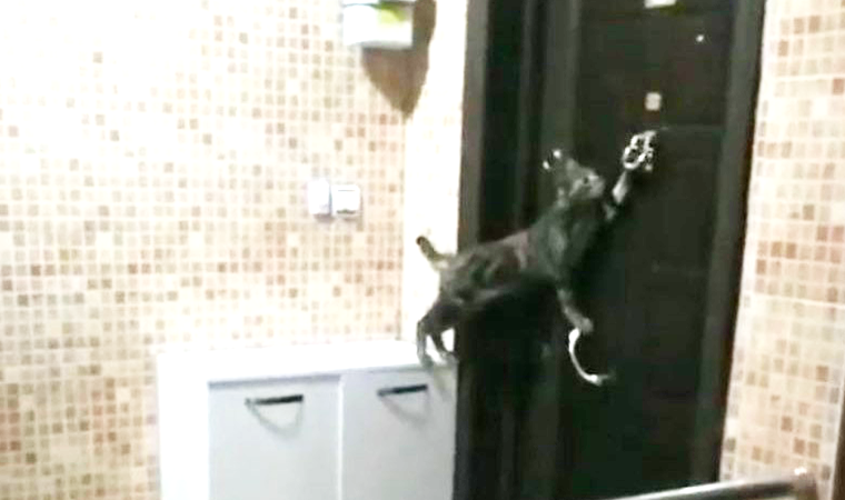 Bor ilçesinde eve girebilmek için kapının kenarındaki ayakkabılığa çıkan kedi, daireye girebilmek için kapının tokmağını çaldı. Kapıyı kimsenin açmaması üzerine defalarca tokmağı çalan ve miyavlayan kedi görenleri gülümsetti.