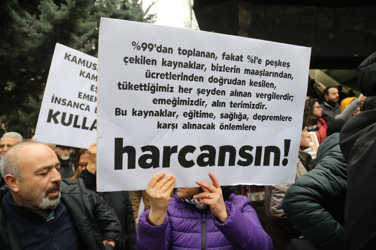 Polisin müdahalesi, vergilerin akıbetini sormak için toplanan yurttaşların tepkisini çekerken, "Kan, zulüm, yoksulluk işte AKP, tecavüzcü Ensar kapatılsın" diye sloganlar atıldı.