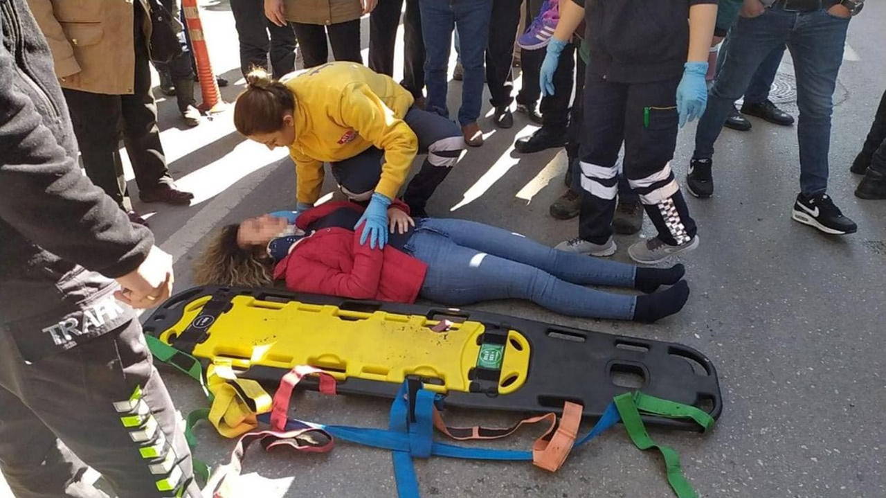 Kaza, dün saat 14.00 sıralarında, Hürriyet Caddesi'nde meydana geldi. Mehmet Tunç yönetimindeki 35 AGD 615 plakalı motosiklet, yolun karşısına geçmeye çalışan 3 aylık hamile Nazife S.'ye çarptı. Güvenlik kamerasına yansıyan kazada, hamile Nazife S. ile yere düşen kasksız motosikletli Tunç yaralandı.