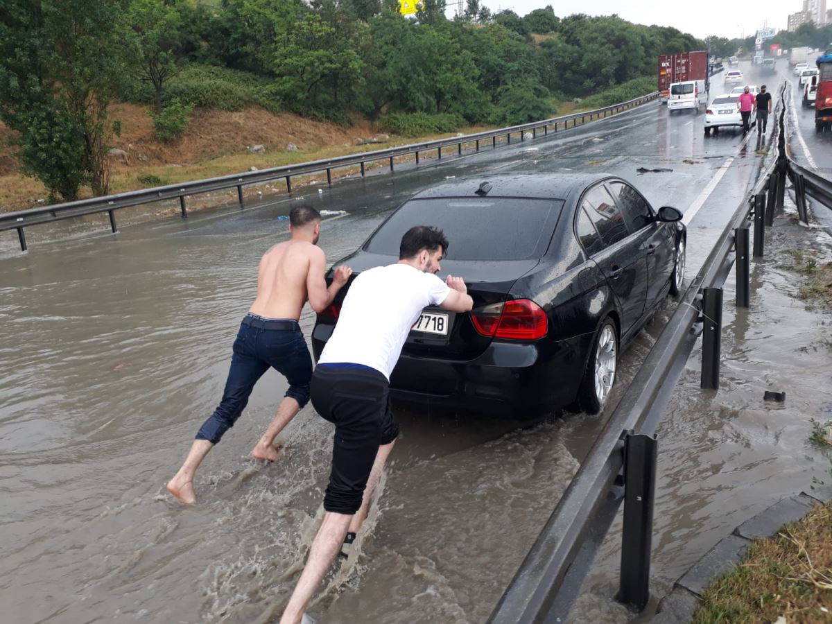 Aynı su birikintisinde kalan bir sürücü ise araçtaki eşini kucaklayarak göle dönen yoldan çıkarttı. Olay yerine itfaiye ve İstanbul Büyükşehir Belediyesi ekipleri sevk edildi. Yolda uzun araç kuyrukları oluşurken, araçlar alternatif yollara yönlendirildi. Ekiplerin yolu açma çalışmaları devam ediyor.