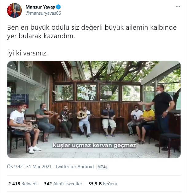 Şarkının ardından konuşan Ankara Genç Müzisyenler Başkanı Serkan Matoğlu da "Bırakın desteği Mansur Başkanı'nın bizi söylemesi hoşumuza gitti, demek ki birileri var yanımızda bizim" ifadelerini kullandı.