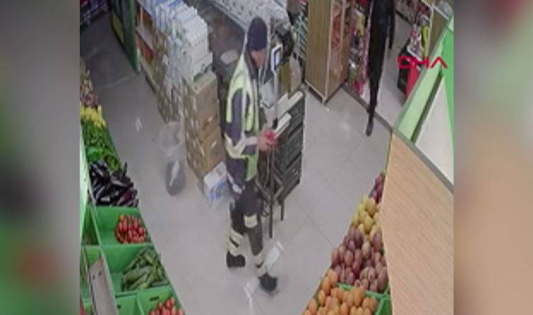 Gaziantep'te belediye işçisi Ahmet Ataş (35), ağaçlandırma çalışmasına ara vererek gittiği markete girmeden önce çamurlu ayakkabılarını çıkarıp, alışveriş yaptı.