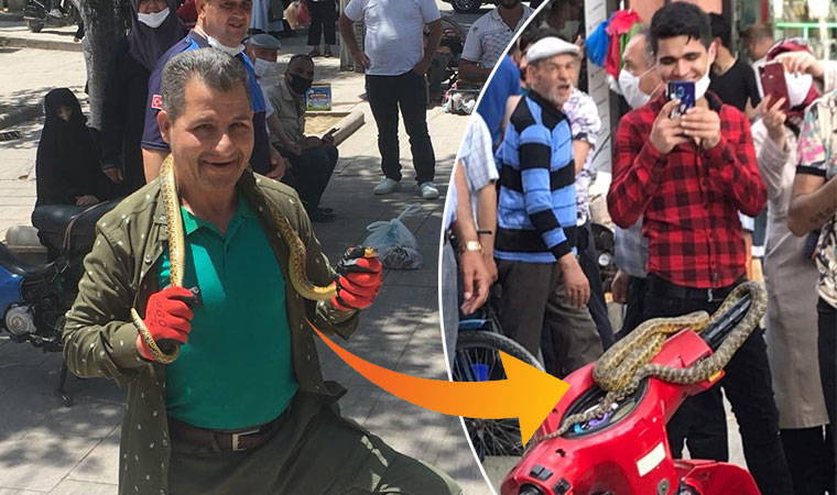 Yenişehir ilçesinde, park halindeki motosikletin gidonunun üzerinde yılanı gören vatandaşlar, cep telefonlarının kameralarıyla görüntü almak için birbiriyle yarıştı. Bu sırada kalabalığın sosyal mesafeye uymadıkları görüldü. Yoldan geçerken kalabalığı görüp gelen Salim Metcikızı, yılanı motosikletin üzerinden aldı. Yılanı omuzlarına koyan Metcikızı, kalabalığa poz verdi. Metcikızı, çağırılan itfaiye ekibinin uyarısı üzerine yılanı araziye götürüp, doğaya saldı.