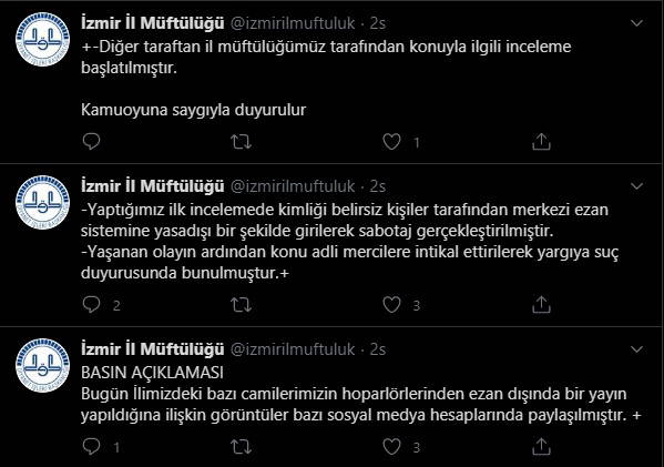 "Bugün saat 17.00 sularında ilimizin çeşitli bölgelerindeki bazı camilerimizin hoparlörlerinden kimliği belirsiz kişilerce merkezi sistemimizin frekansına korsan şekilde müdahil olmak suretiyle bir sabotaj gerçekleştirilmiştir. Konu ile ilgili gerekli suç duyurusunda bulunulmuş ve gerekli inceleme başlatılmıştır. Kamuoyuna saygıyla duyurulur."