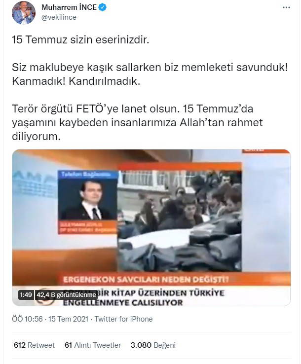 İnce, sosyal medya hesabı Twitter üzerinden İçişleri Bakanı Süleyman Soylu, AKP Genel Başkanı ve Cumhurbaşkanı Recep Tayyip Erdoğan, Eski Başbakan ve AKP Genel Başkanvekili Binali Yıldırım'ın geçmiş yıllardaki 'FETÖ'ye ilişkin sözlerinin yer aldığı videoyu paylaştı.