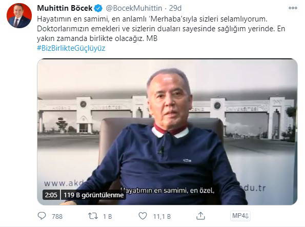 Antalya Büyükşehir Belediye Başkanı Muhittin Böcek paylaşımında, "Hayatımın en samimi, en anlamlı ‘Merhaba'sıyla sizleri selamlıyorum. Doktorlarımızın emekleri ve sizlerin duaları sayesinde sağlığım yerinde. En yakın zamanda birlikte olacağız. MB #BizBirlikteGüçlüyüz" ifadelerini kullandı.