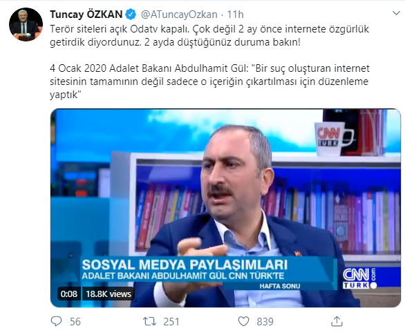 Tuncay Özkan, paylaşımında; Adalet Bakanı Abdulhamit Gül'ün 2 ay önce katıldığı bir TV programındaki sözlerini hatırlatarak, "Çok değil 2 ay önce internete özgürlük getirdik diyordunuz. 2 ayda düştüğünüz duruma bakın" dedi.