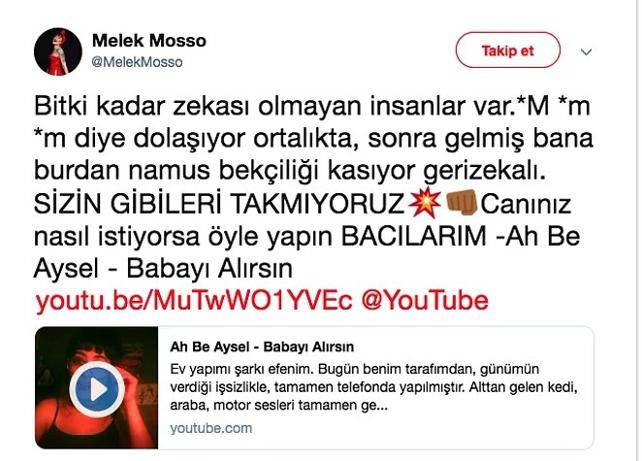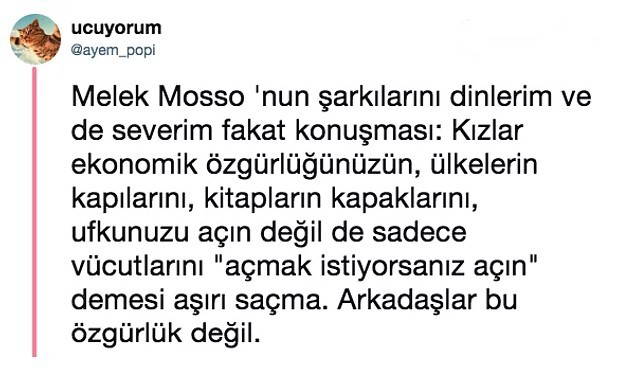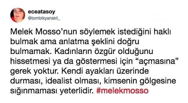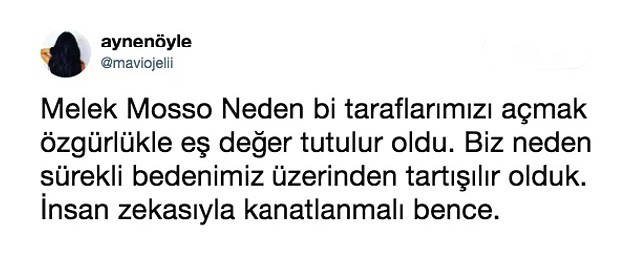 Kadınların doğal haklarının gasp edilmesine sessiz kalmamaları gerektiğini söyleyen isimlerden biri de şarkıcı Melek Mosso oldu. Verdiği konserde yaptığı konuşma ile kadınların sorunlarına kendince dikkat çeken şarkıcı; “Kimsenin nasıl davranmanız gerektiğini söylemesine ihtiyacınız yok kızlar! Aksini söyleyenlere ‘babayı alırsın' diyoruz” sözleri ve orta parmak hareketiyle gündem oldu.