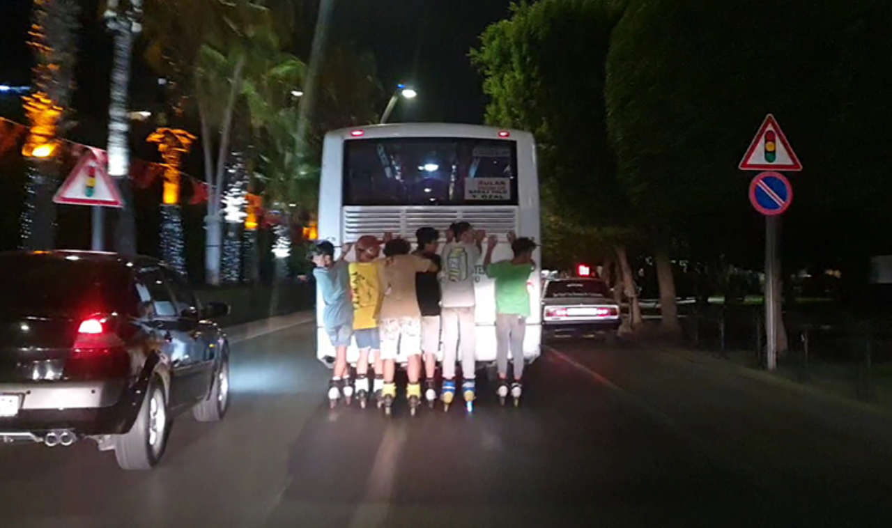 Seyhan ilçesinde dün akşam saatlerinde kentin en yoğun bölgesi olan Atatürk Caddesi'nde patenli 6 çocuk, bir özel halk otobüsüne arkadan tutunup trafikte ilerledi. Bir süre bu şekilde yolculuk eden çocuklar, trafikteki diğer sürücülerde tedirginliğe yol açtı. Çocukların teklikeli yolculuğu cep telefonuyla anbean kaydedildi. Çocuklar, otobüsün trafik ışıklarına gelmesiyle aracı bırakıp, farklı yöne paten sürerek gözden kayboldu.