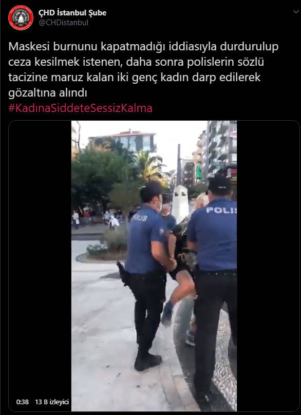 Çağdaş Hukuçular Derneği İstanbul Şubesi, sosyal medya üzerinden Kadıköy'de maskesi burnunu kapatmadığı iddiasıyla durdurulup ceza kesilmek istenen, daha sonra da darp edilen kadınların videosunu paylaşarak tepki gösterdi.