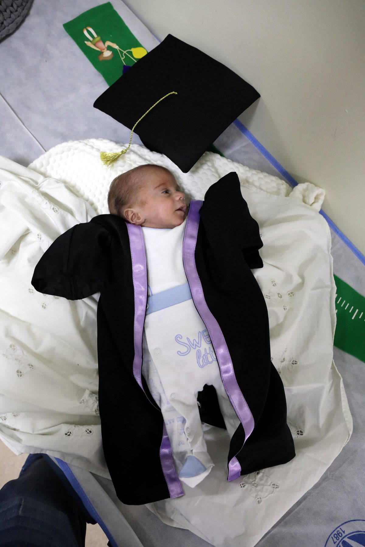 Çok yıpratıcı bir süreçten geçtiklerini belirten Abbasoğlu, “Zamanında doğan bir bebek olsaydı şuan bir haftalık 2 kilogram 150 gram olarak dünyaya gelmiş olacaktı. Ama o annesinin karnında geçirmesi gereken süreyi bizimle geçirmeyi tercih etti. Yoğun bakım süreci oldukça zor ve yıpratıcı bir süreçti. Birçok dalgalanmalar yaşadık, defalarca hayatının sınırında geldi gitti. Annesini, babasını ve beni de çok korkuttu. Bu süreç herkes için okul gibi olduğu için biz bebeklerimizi taburcu ederken bir mezuniyet serenomisi yaptık. Bebeklerimize küçük boyutlarda cübbe ve kep hazırlattım. Mor bilindiği gibi prematüre bebek rengi olduğu için de cübbelerimizi mor bir satenle süslemeyi tercih ettik. İsmail için de kendi aramızda bu şekilde bir tören düzenledik" diye konuştu.
