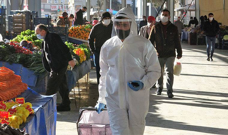 Türkiye genelinde hafta sonu sokağa çıkma yasağı uygulaması öncesinde vatandaşlar market ve pazar yerlerinde yoğunluk oluşturdu. Tokat’ta da pazar yerinde polis ve zabıt ekipleri önlemlerini artırdı. Pazar yerine tulum giyerek giren Mustafa Işık (30) ilginç görüntüler oluşturdu. Maskesinin yanı sıra siperlik ve eldiven alışveriş yapan Işık, tulumun arkasına “Maske, mesafe ve hijyen, önlem al güvende kal” yazarak dikkat çekmeye çalıştı. Artan koronavirüs vakaları nedeni ile önlem aldığını belirten Işık, “Genelde pazar alışverişi yaparken bu kıyafeti giyiyorum. Kalabalık ortamlarda virüs bulaşma riski yüksek olduğu için kendimi korumak için bu şekilde giyindim” dedi.