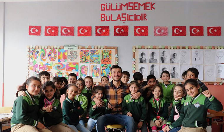 Van'ın Tuşba ilçesindeki Akköprü Ortaokulunda 10 yıldır görev yapan sınıf öğretmeni Hulusi Çakır, öğrencilerinin dikkatini çekebilmek için 9 ay önce 4-B sınıfının duvarına "Gülümsemek bulaşıcıdır" yazısını astı.