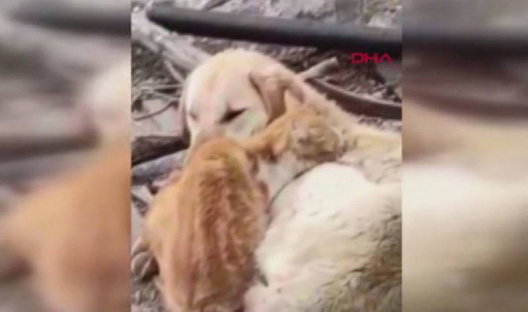 Alacakaya ilçesinde yağmurdan ıslanan ve üşüdükleri görülen 2 kedi ile 1 köpeğin birbirlerine sokulduğu anlar cep telefonu kamerası ile görüntülendi.
