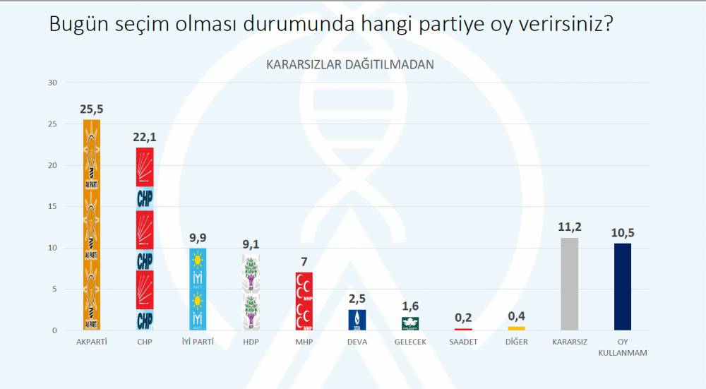Araştırmaya göre AKP’nin oy oranı kararsızlar dağıtılmadan yüzde 25.5 oranında görünüyor. CHP ise yüzde 22.1 bandında.