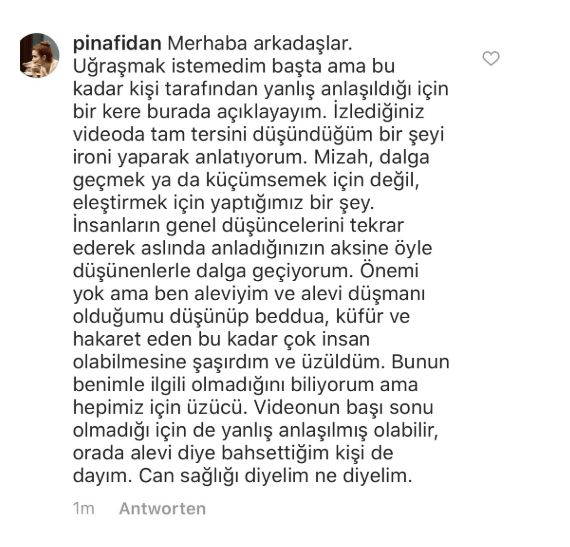 Tepkilerin ardından bir açıklama yapan Fidan, kendisinin de Alevi olduğunu, gösterisinde bahsettiği kişinin ise dayısı olduğunu iddia etti. Ancak açıklama da tepkileri dinidirmedi.