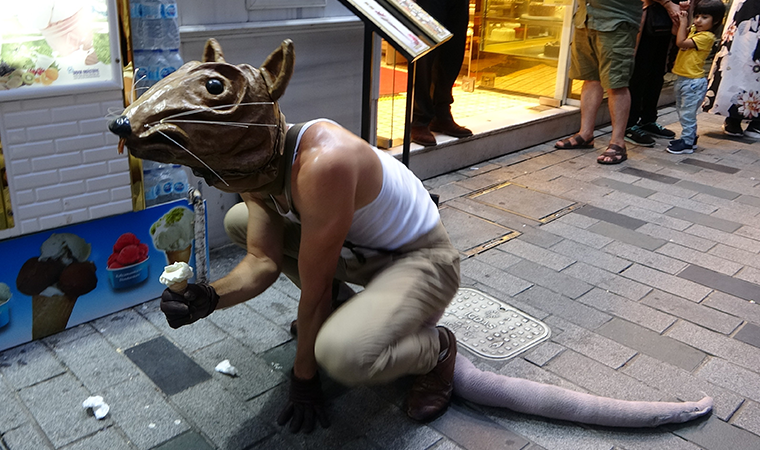 Amerika’dan bir arkadaşını ziyaret etmek amacıyla Türkiye’ye gelen New York’lu sokak sanatçısı Jonothon Lyons, yanında getirdiği fare kostümüyle akşam saatlerinde Taksim İstiklal Caddesi’nde yaptığı şovla vatandaşların ilgi odağı oldu. Özellikle çocukların yoğun ilgi gösterdiği sokak sanatçısı giydiği kostümle İstiklal caddesinde mini bir şov yaptı.