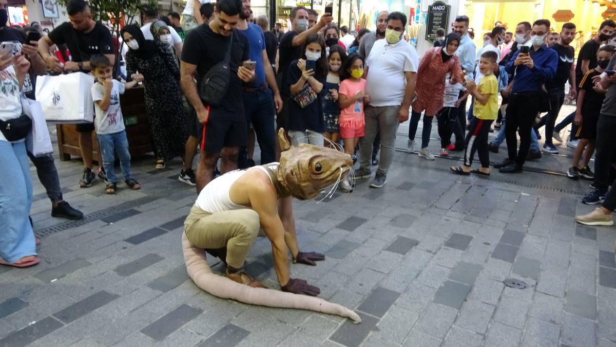 Fare kostümüyle maraş dondurmacısından dondurma alan Amerikalı sokak sanatçısı renkli görüntüler oluştururken vatandaşlarla da selfie çekilmeyi ihmal etmedi.