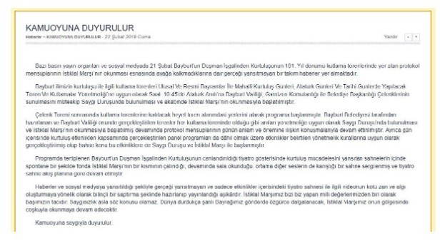 Bayburt Valiliği yaşanan durum hakkında yazılı bir basın açıklaması yayınladı. Görüntülerin gerçeği yansıtmadığı belirtilen açıklamada, sahnelenen oyunda İstiklal Marşı'nın bir bölümünün çalındığı belirtildi. Saygısızlığın asla söz konusu olamayacağı vurgulanan açıklamada şu ifadeler yer aldı: