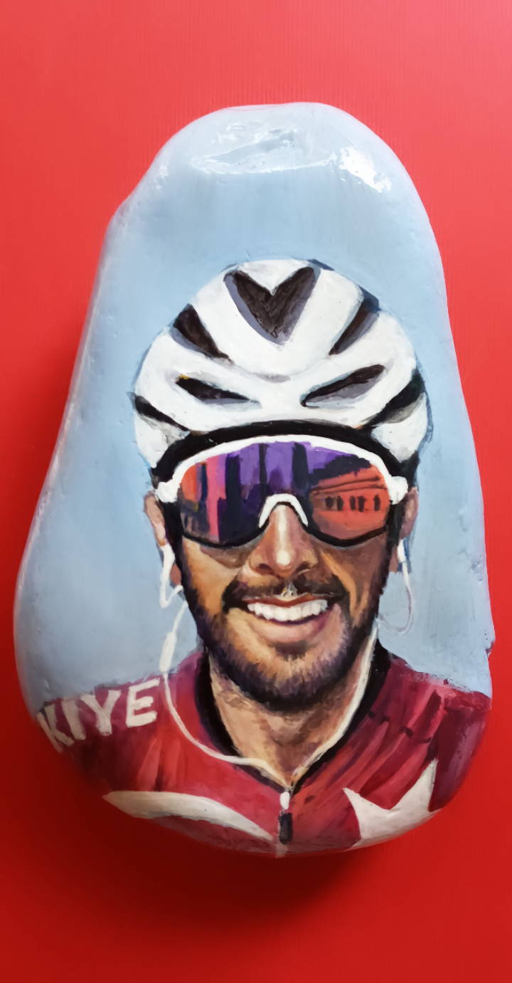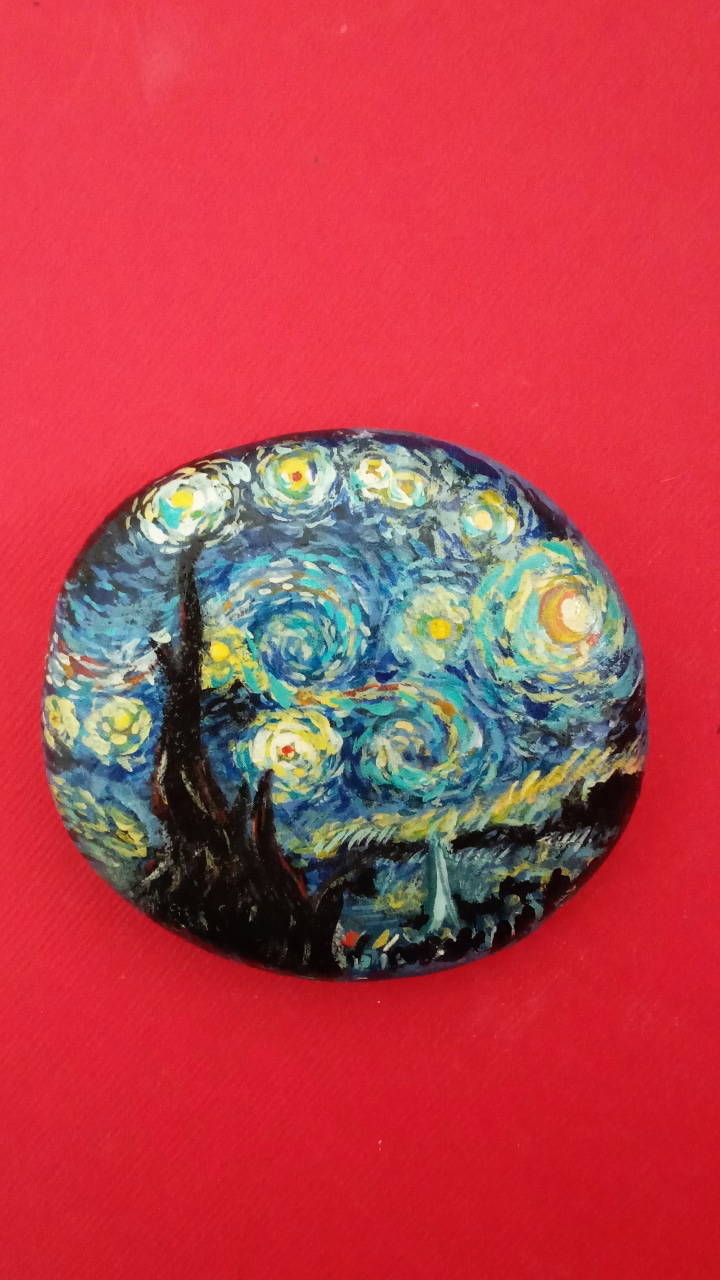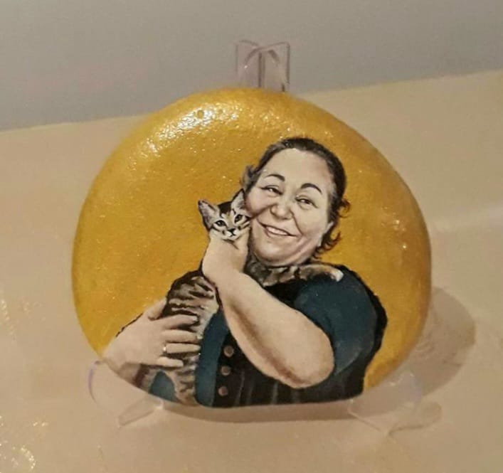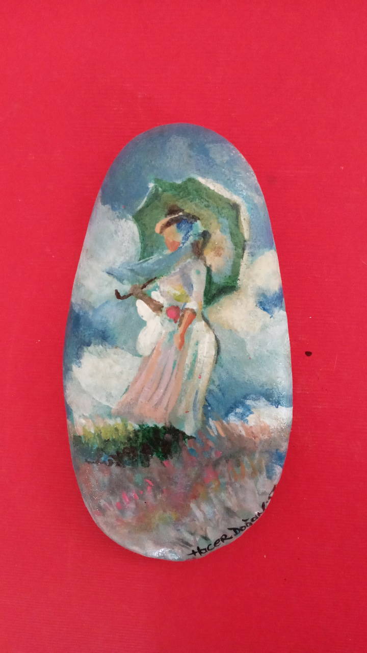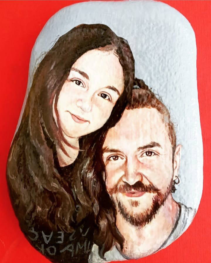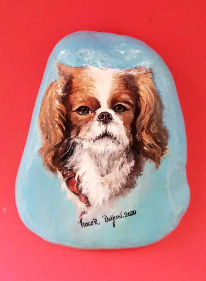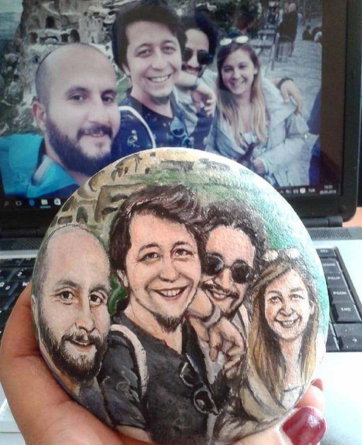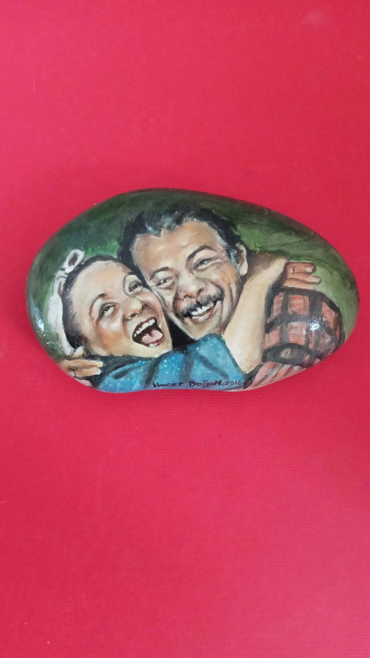 "1998'den beri dans ekiplerinde çalısıyordum ve geçirdiğim bisiklet kazası sonucu diz kapağım kırıldı. Bu benim icin cok travmatik bir sürecti. 3 ay ayağımın alçılı olarak kaldığı süreçte, yakın çevrem beni deniz kenarına götürdüklerinde minik taşlar toplamaya başladım. Başlangıçta eski-yeni ojeler ile ojenin kendi fırçası ve detaylar icin kürdan kullanarak basit figürler veya mandala yapıyordum. Sonra portre denedim ancak neden boyayla yapmıyorum diye düşünüp malzememi suluboya ve akrilik boyaya çevirerek portrelere yoğunlaştım. Ürettikçe ağrılarımı unutuyordum, taş boyama bana adeta terapi gibi gelmeye başladı. Rahatsızlığım hafifledikten sonra bir yakınımın tavsiyesiyle bu resimli taşları, hem belediye tarafından açılan standlarda hem de 'hacerdogan.paintings' Instagram hesabım üzerinden seyire ve satışa sundum."
