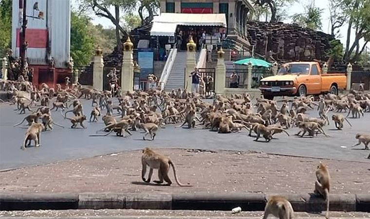 Ekonomisi çoğunlukla turizme dayalı olan Tayland'da koronavirüs salgını sonrası boşaldı. Turistler tarafından beslenen maymunlar ise yiyecek sıkıntısı nedeniyle ufak çaplı bir ayaklanma provası yaptı.