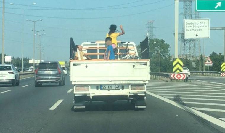 Çocukların oyunlar oynadığı tehlikeli yolculuk vatandaşın cep telefonu kamerasına yansıdı. Görüntülerde, pikap kamyonetin kasasında yolculuk eden 3 çocuğun araç seyir halindeyken ayakta durduğu ve oyunlar oynadığı görüldü.