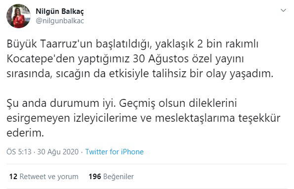 Baygınlık geçiren Balkaç sosyal medya hesabı Twitter üzerinden "Büyük Taarruz'un başlatıldığı, yaklaşık 2 bin rakımlı Kocatepe'den yaptığımız 30 Ağustos özel yayını sırasında, sıcağın da etkisiyle talihsiz bir olay yaşadım.