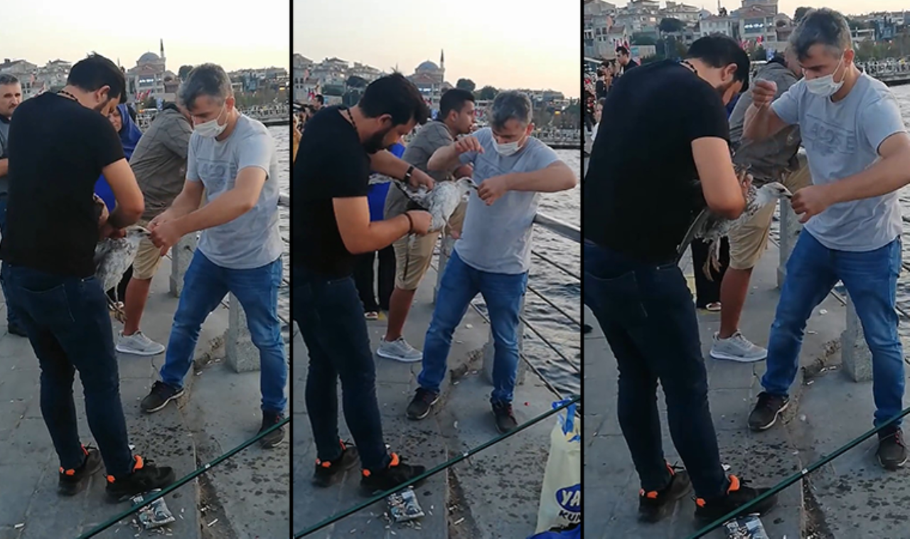 Görüntülerde, misinaya dolanan martıyı vatandaşların kurtarmaya çalıştığı ve misinadan kurtarılan martının denize bırakıldığı görülüyor.