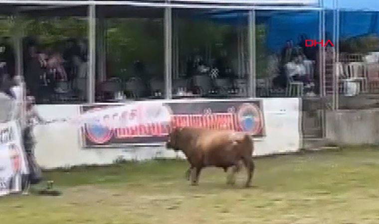 Arenadan kaçan boğanın tribüne çıkması kamerada