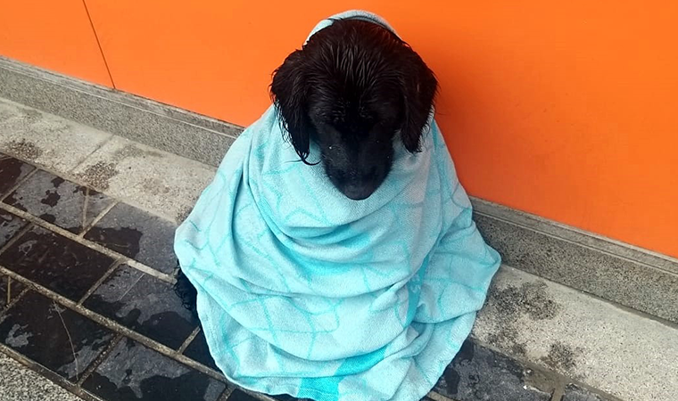 Yağmurdan ıslanan yavru köpeği görünce üzerine battaniye örttü