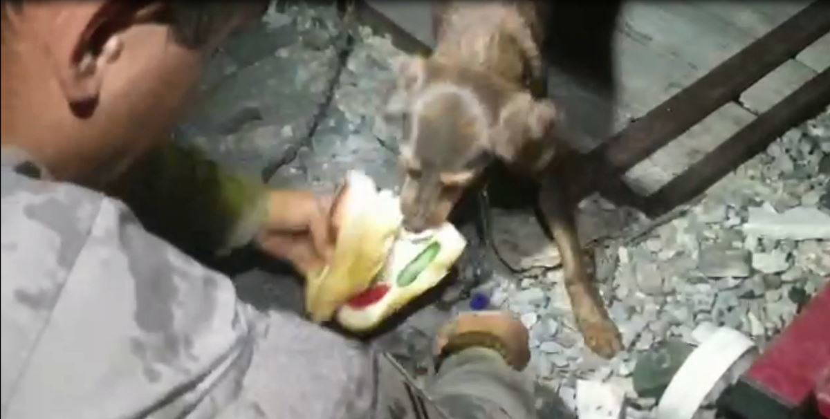 Paylaşılan görüntüde ise yavru köpeklerin taş yığınları arasından kurtarılarak, anneleri ile buluşturulması, jandarmanın da köpeği elleriyle beslemesi yer aldı.