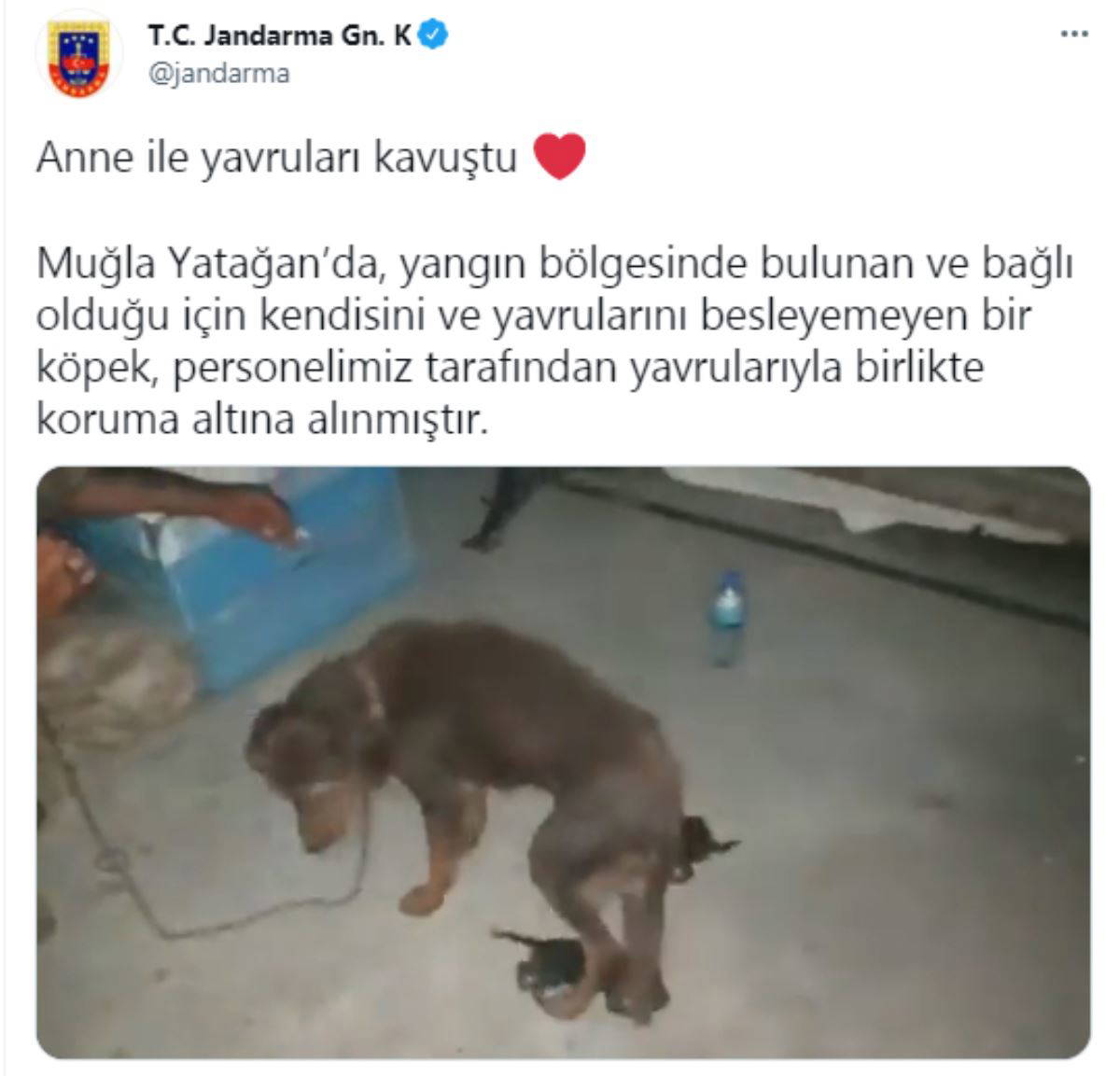 Jandarma Genel Komutanlığı'nın Twitter'daki hesabından yapılan paylaşımda, "Muğla Yatağan'da, yangın bölgesinde bulunan ve bağlı olduğu için kendisini ve yavrularını besleyemeyen bir köpek, personelimiz tarafından yavrularıyla birlikte koruma altına alınmıştır" denildi.