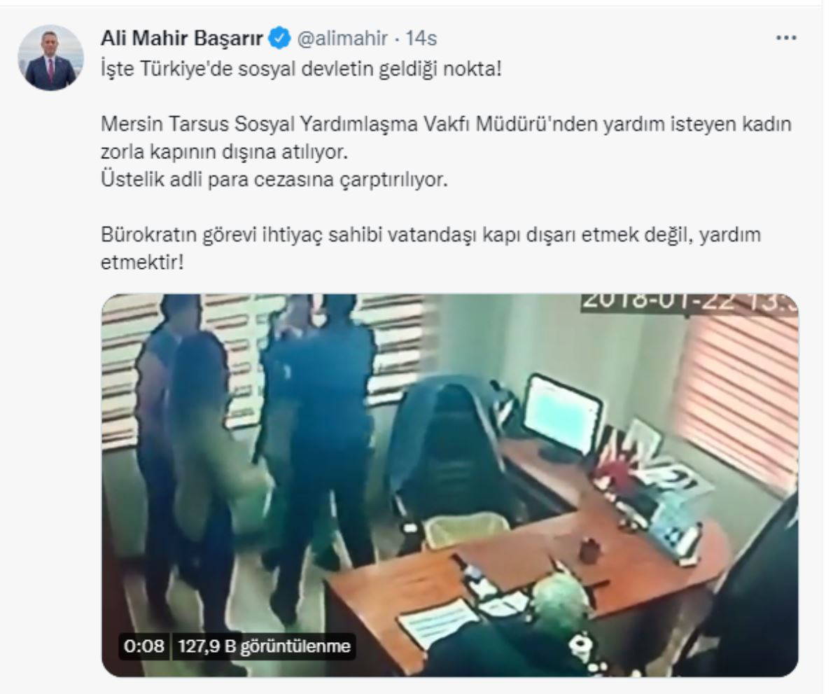 Yaşanan olayın görüntülerini sosyal medya hesabından paylaşan CHP Mersin Milletvekili Ali Mahir Başarır, ''İşte Türkiye'de sosyal devletin geldiği nokta! Mersin Tarsus Sosyal Yardımlaşma Vakfı Müdürü'nden yardım isteyen kadın zorla kapının dışına atılıyor. Üstelik adli para cezasına çarptırılıyor. Bürokratın görevi ihtiyaç sahibi vatandaşı kapı dışarı etmek değil, yardım etmektir'' dedi.