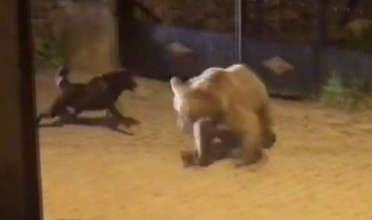 Kars’ın Sarıkamış ilçe merkezinde yiyecek arayan yavru boz ayının köpek tarafından kovalanması ise cep telefonu kamerasına yansıdı.