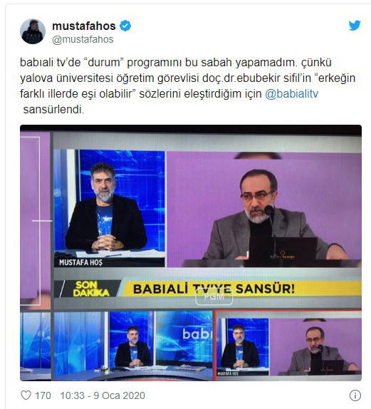 Babıali TV YouTube’un engellemesi nedeniyle bugün yayın yapamadı. “Durum” programı sunucusu gazeteci Mustafa Hoş Twitter hesabından yaptığı duyuruda, “babıali tv’de “durum” programını bu sabah yapamadım. çünkü yalova üniversitesi öğretim görevlisi doç.dr.ebubekir sifil’in “erkeğin farklı illerde eşi olabilir” sözlerini eleştirdiğim için @babialitv sansürlendi” dedi.