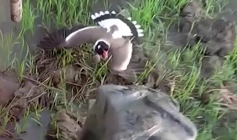 Kuşun aracın ilerlediği yola çıkıp yüksek sesle çığlık atmaya başlaması üzerine yuvayı fark eden çiftçi, traktörü tam zamanında durdurdu. Kuşun yuvasını kurtarması, kameraya yansıdı.