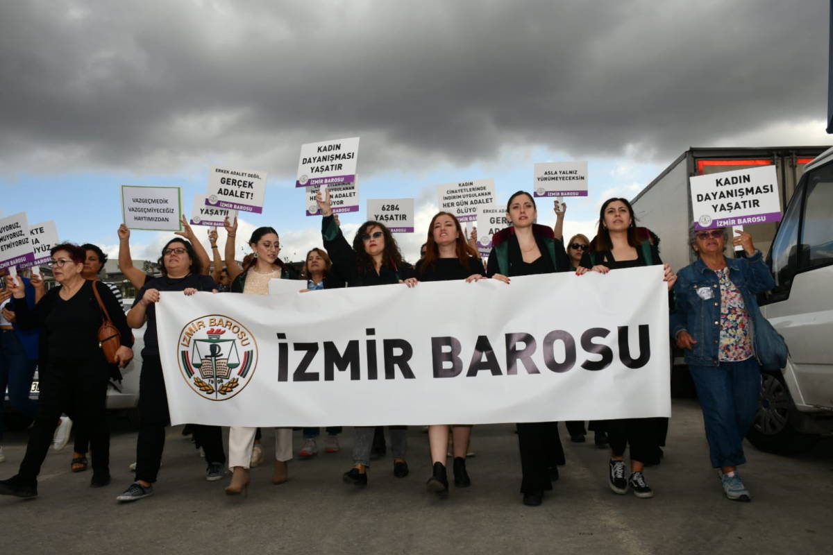 “Kadına yönelik şiddet evde, iş yerinde, okulda, hastanede, adliyede, evet adalet dağıtıldığı, saray olduğu söylenen yerde!” başlıklı basın açıklamasını okuyan İzmir Barosu Kadın Haklari Merkezi üyesi Av. Büşra Ergüven, “Dün burada, Seferihisar Adliye binasının önünde, tam bulunduğumuz yerde, adalete erişmek isteyen bir kadın, boşanma aşamasında olduğu eşi tarafından saldırıya uğramış; adliye binasına sığınmasına rağmen fail eylemine adliye binası içinde devam etmiş ve en güvenli yerlerden olduğunu düşündüğümüz adliyede kadını bıçaklamıştır. Ağır yaralanan kadın, akşam saatlerinde ölmüştür. Devlet, tıpkı dışarıda olduğu gibi adaleti dağıttığı yerde de kadını koruyamamıştır” diye konuştu.