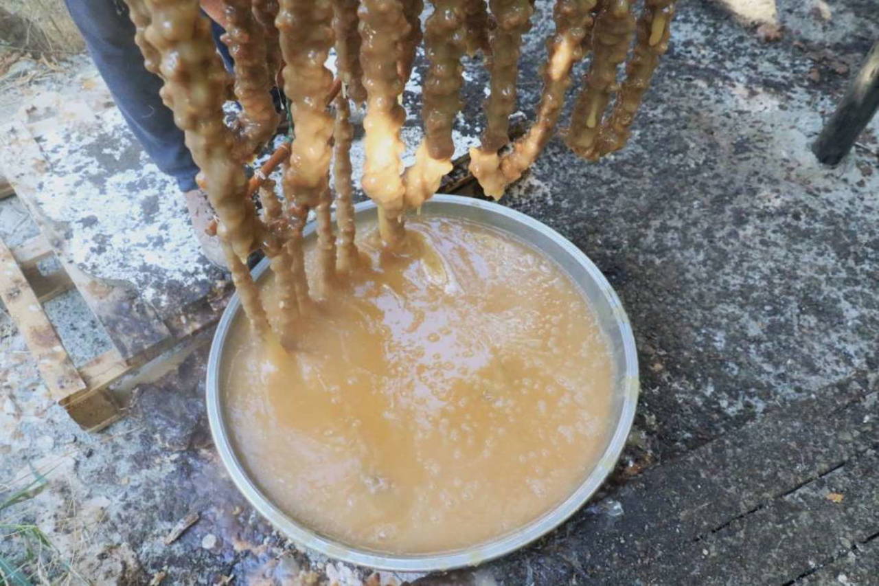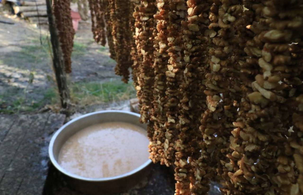 Ardından bağlardaki üzümler toplanarak sıkıldıktan sonra bölgeye has olan beyaz toprakla mayalandırılıyor ve daha sonra şıra haline getirilip kazanda kaynatılıyor. Cevizler tek tek ipe dizilerek, kazanda kaynatılan üzüm şırasına 3-4 defa batırılarak hazır hale getiriliyor.