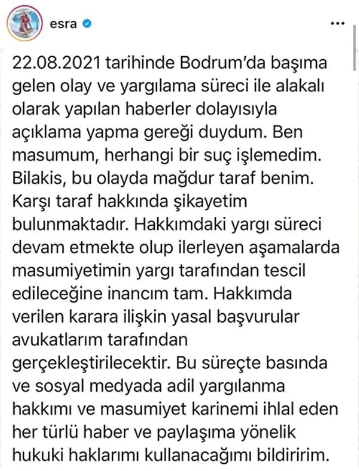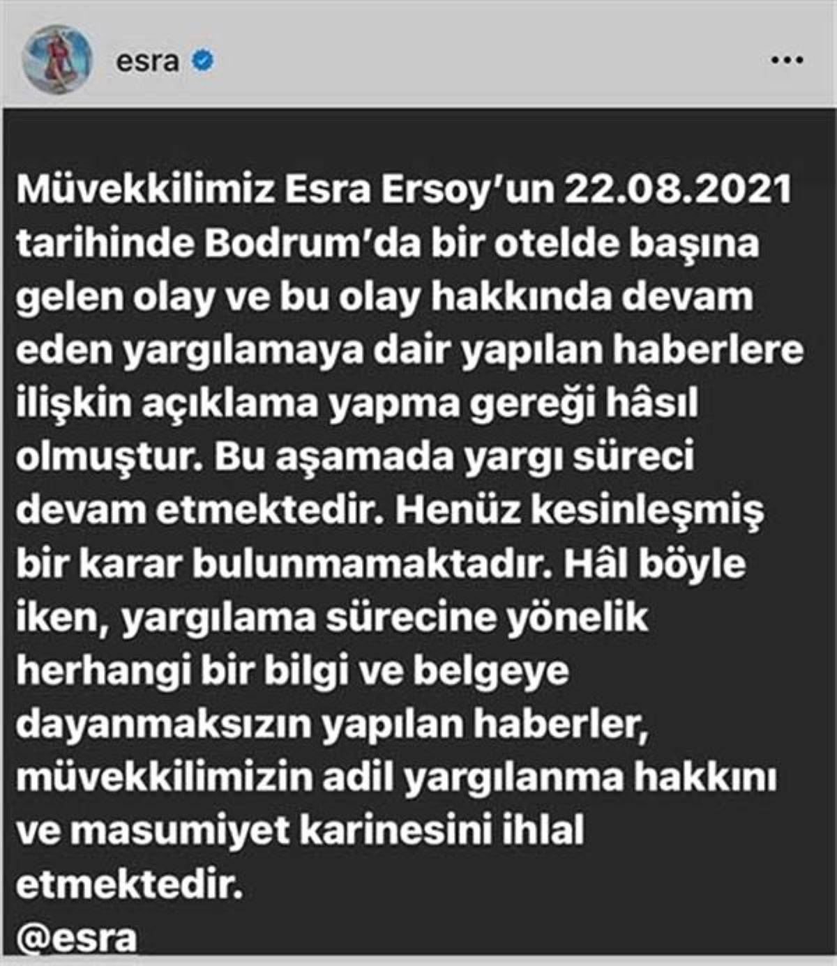 açıklama yaptı. Açıklamada, "Müvekkilimiz Esra Ersoy'un 22 Temmuz 2021