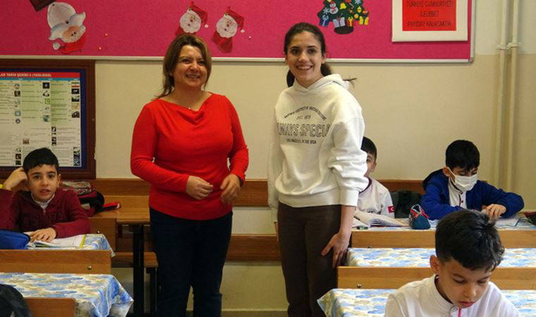 Mehtap Eroğlu, sınıfına tekrar davet ettiği meslektaşı Kübra Tağ’ı öğrencilerine tanıtırken, "Ona canım kızım derken, şimdi ‘Kübra öğretmenim’ diyorum. Minicik çocuktu büyüdü ve benimle aynı meslek sahibi oldu. Sizleri de yıllar sonra böyle görmek en büyük isteğim" diye konuştu.