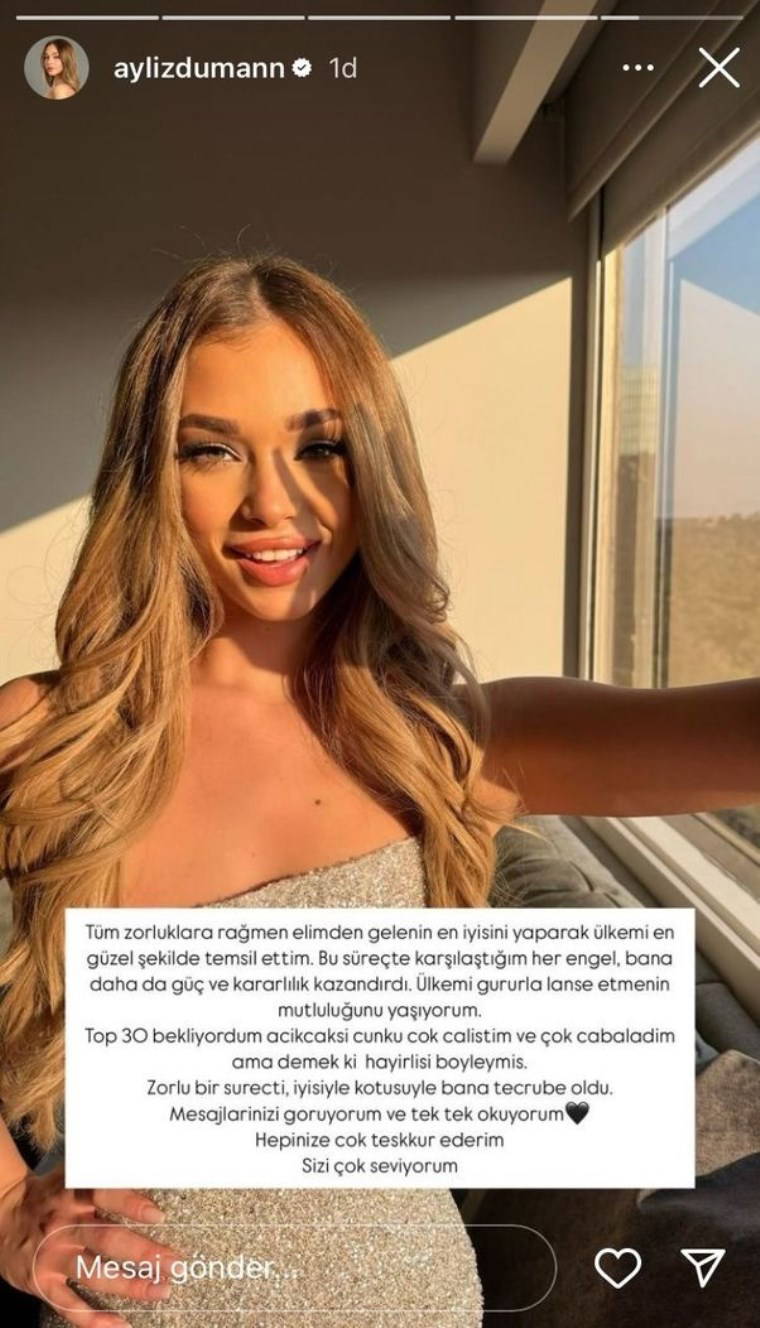 Ayrıca, "TOP 30 bekliyordum çünkü çok çalıştım, ama demek ki hayırlısı böyleymiş. Zorlu bir süreçti, iyisiyle kötüsüyle bana tecrübe oldu. Mesajlarınızı görüyorum ve tek tek okuyorum. Hepinize çok teşekkür ederim. Sizi çok seviyorum" şeklinde duygusal bir mesaj paylaştı.