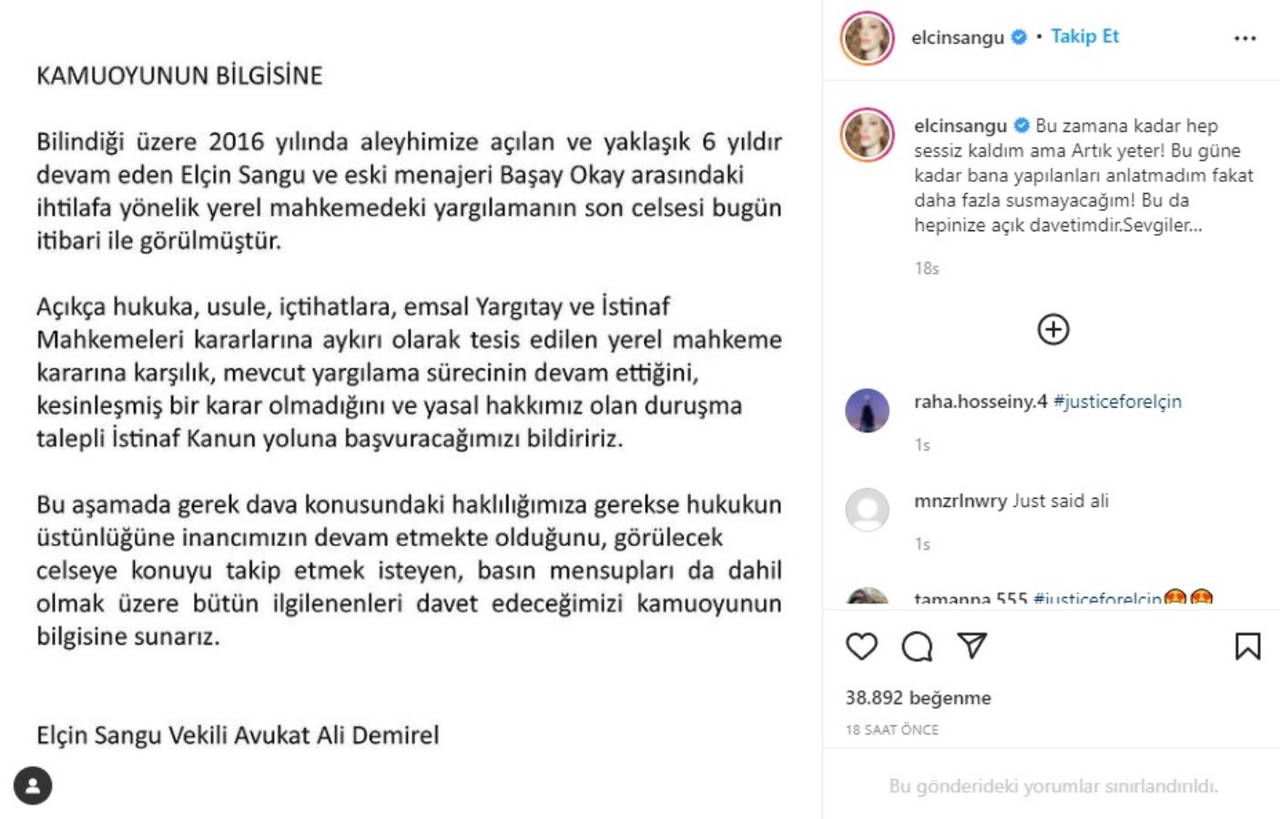 Mahkeme kararına isyan eden Elçin Sangu, avukatı aracılığıyla açıklama yaptı. Sangu, "Bu zamana kadar hep sessiz kaldım ama yeter! Artık susmayacağım" dedi.