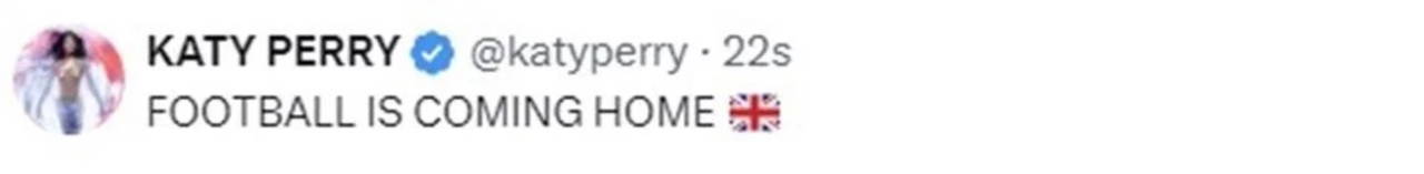 İngiliz oyuncu Orlando Bloom ile evli olan şarkıcı, X hesabında "Futbol eve dönüyor" mesajını Birleşik Krallık bayrağı emojisiyle paylaştı.
