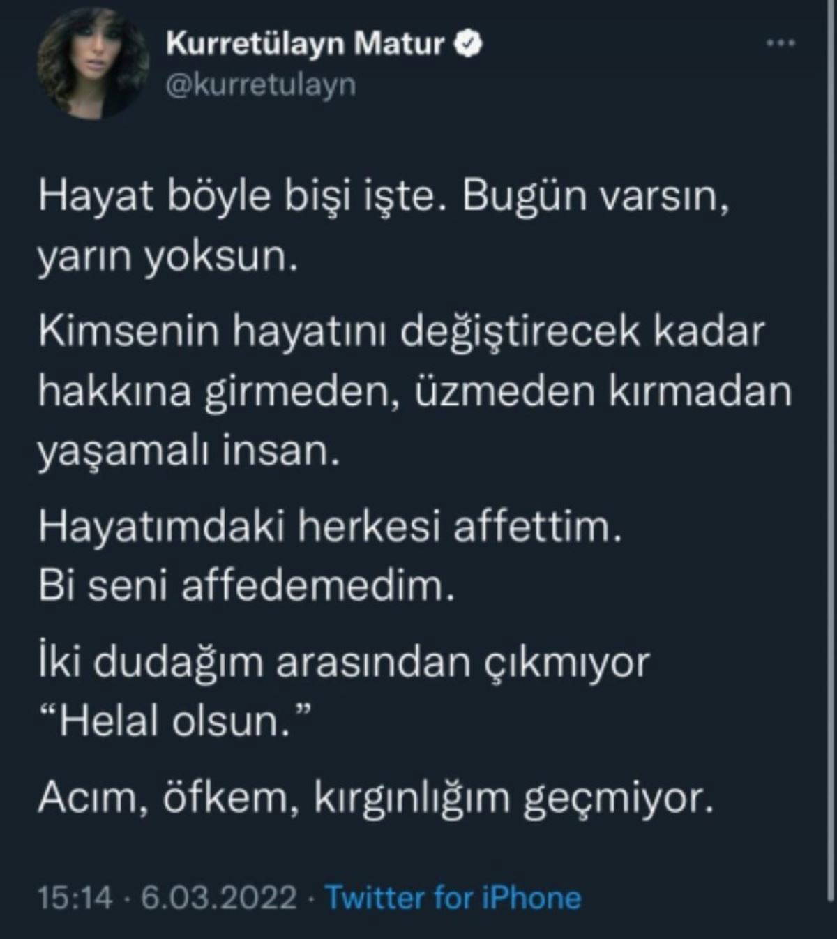Kurretülayn Matur, "Hayatımdaki herkesi affettim. Bir seni affedemedim" dediği paylaşımında şu ifadeleri kullandı: