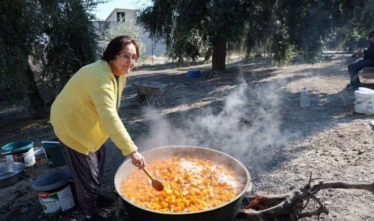 Kışın Adana ve Hatay bölgesinde sofraların vazgeçilmezi olan kabak tatlısı için Kozan'da kadınlar imece usulü hazırladıkları bal kabakları için kazan başında mesai yaptı.