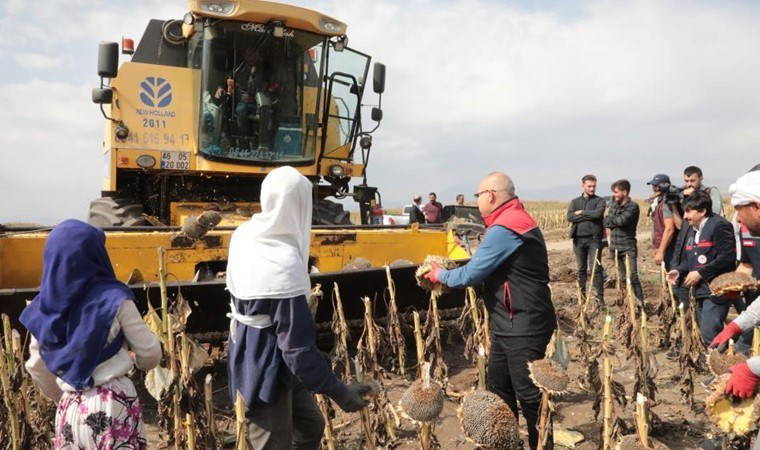 Ağrı'da, tarımsal ürün çeşitliliğinin artırılması ve çiftçiye alternatif üretim alanının oluşturulması için hayata geçirilen projelerden biri olan ayçiçeği projesi ile 34 bin dekar alana ekilen ayçiçekleri hasat edilmeye başlandı. Bu doğrultuda merkeze bağlı Tezeren köyünde çiftçilerle beraber ayçiçeği hasadına katılan Ağrı Valisi Mustafa Koç, bu yıl yapılacak olan hasadın ardından ilin tarım ekonomisine 310 milyon TL değer katmasını beklediklerini belirtti.