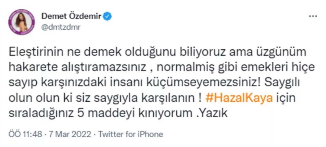 "Eleştirinin ne demek olduğunu biliyoruz ama üzgünüm hakarete alıştıramazsınız, normalmiş gibi emekleri hiçe sayıp karşınızdaki insanı küçümseyemezsiniz! Saygılı olun olun ki siz saygıyla karşılanın ! #HazalKaya için sıraladığınız 5 maddeyi kınıyorum. Yazık..."