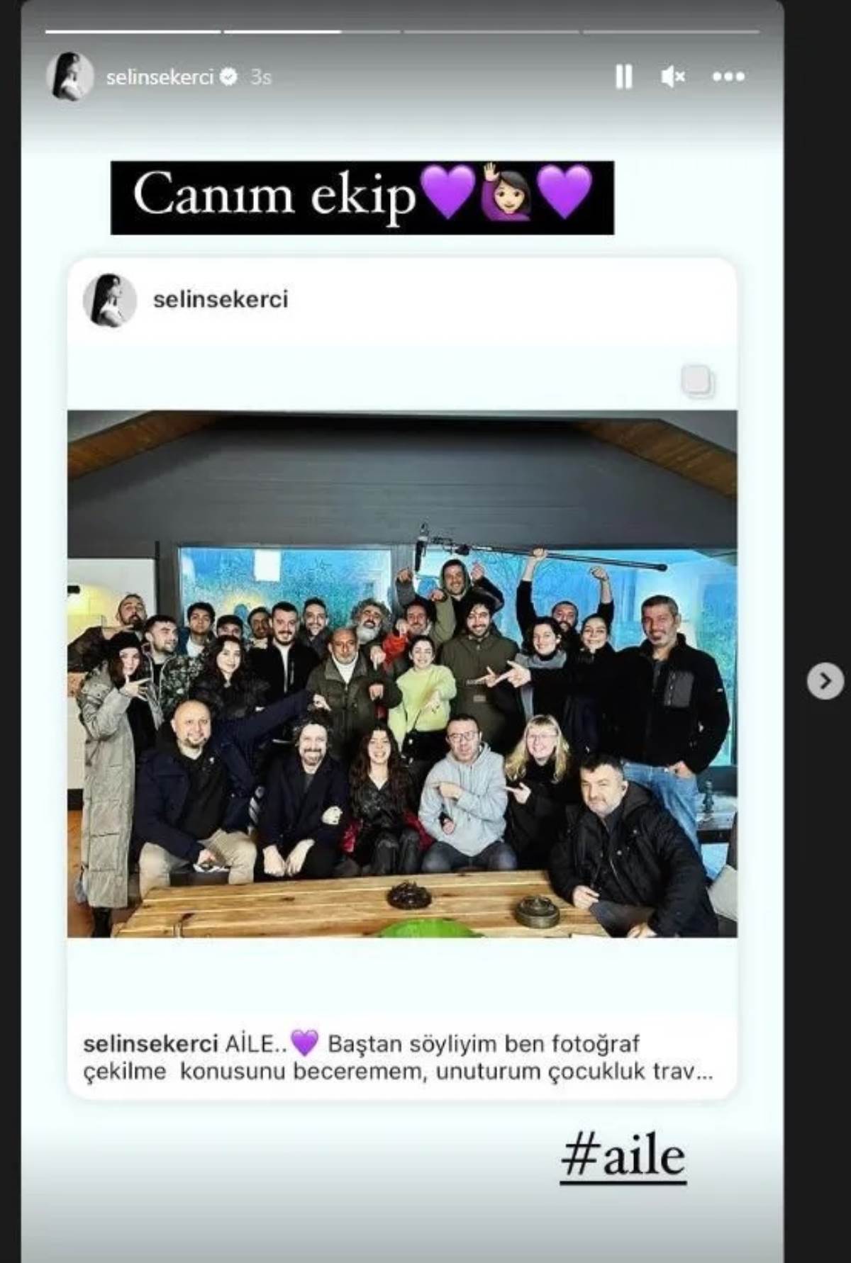 "Aile. Baştan söyleyeyim ben fotoğraf çekilme konusunu beceremem, unuturum çocukluk travması… Ekip fotoğrafımızı da canım ekip akıl etti diğerlerini de Merve ve Efsun’dan( bir an beni bırakmayan ) topladım. 12 bölüm beni aşırı mutlulukla, huzurla, kahkahayla çalıştıran güzel ekibim. Oyuncu arkadaşlarım, ustalarım! Canım Cem hocam, Gökçen hocam. Hepinizi ayı gibi özleyeceğim be! Siz de beni özleyeceksiniz, biliyorum. Gençliğimiz var, daha denk geliriz. Eksikler çok burada toplayabildiğim kadar topladım hakkınızı helal edin artık."
