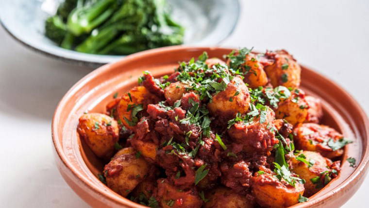 Önceden küp küp kestiğiniz patatesleri sıcak suda haşlayın. Sos için doğradığınız soğanları soteleyin. Sarımsak, toz biber ve domates püresini de ekleyip 5 dakika daha kavurun. Haşlanmış patatesleri bir tavaya alın. Kızarıncaya kadar ara ara karıştırarak pişirin. Kızaran patatesleri servis tabağına alın. Sosu blendardan geçirin. Sos soğuduktan sonra üzerine sirke ve mayonezi ekleyip karıştırın. Patateslerin üzerine sostan ekleyin ve servis edin. Patatas Bravas tarifiniz hazır. Afiyet olsun!