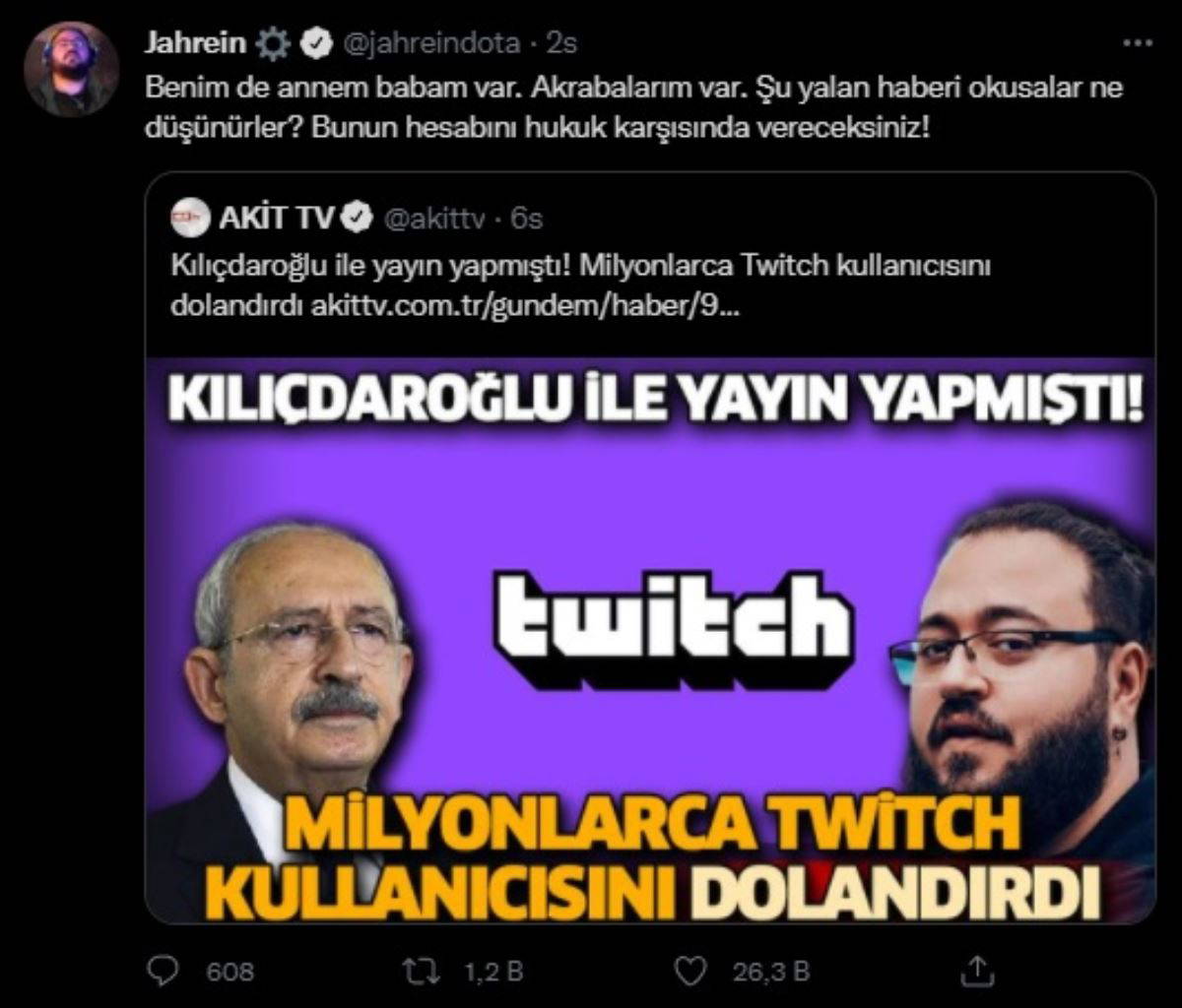 'Jahrein' lakaplı ünlü yayıncı, son olarak yandaş medya tarafından dolandırıcı ilan edildi. Twitch'te kara para aklama iddialarını gündeme getiren Sonuç, Akit TV'nin "Kılıçdaroğlu ile yayın yapmıştı! Milyonlarca Twitch kullanıcısını dolandırdı" başlıklı haberine sosyal medya üzerinden tepki gösterdi.